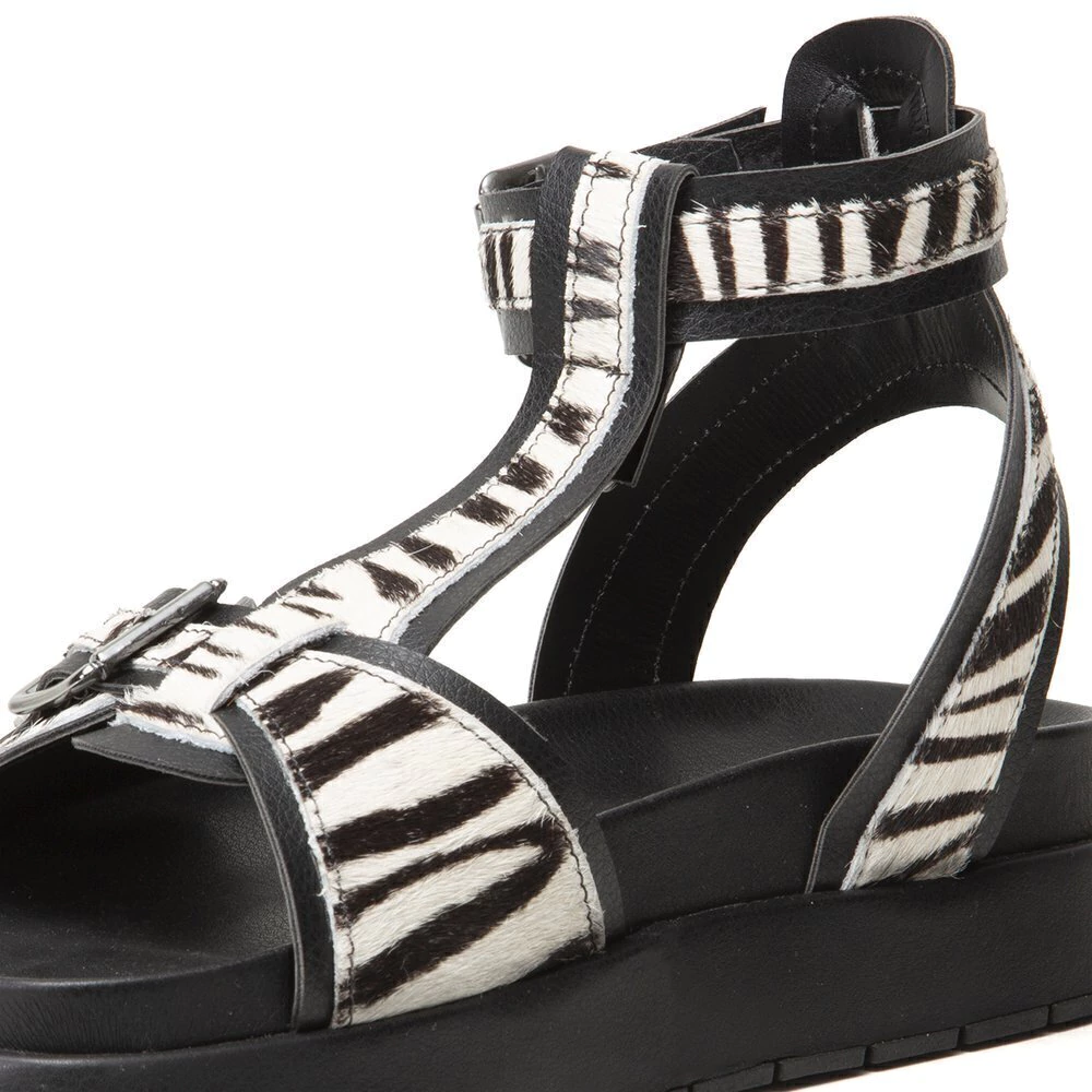 - Detalhes: A tira com pelo de onça ou zebra desce elegantemente pelo peito do pé e envolve o tornozelo, realçando a silhueta dos pés e destacando o visual do calçado. Fechamento: Fivela no peito do pé: Ajustável, garantindo maior segurança e conforto no uso.